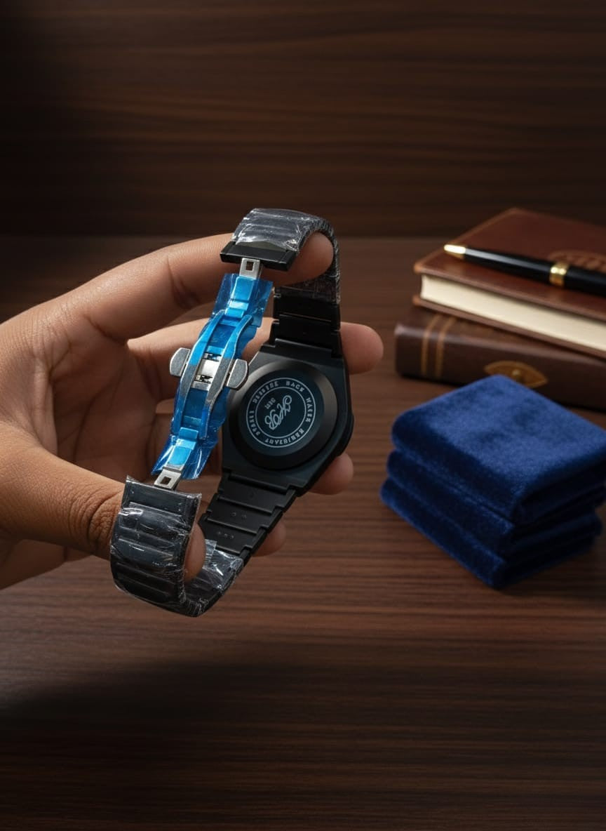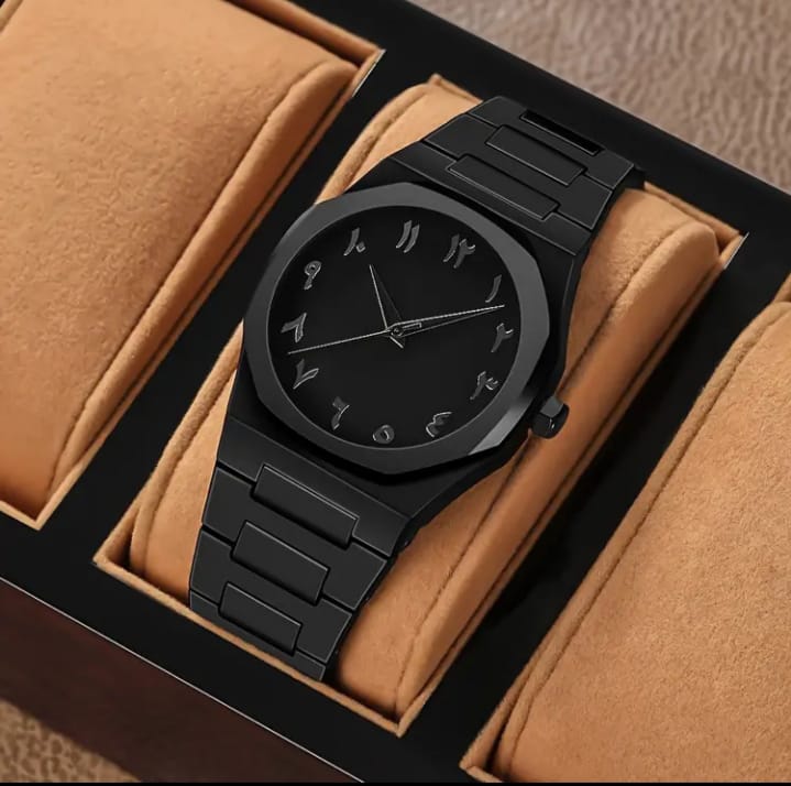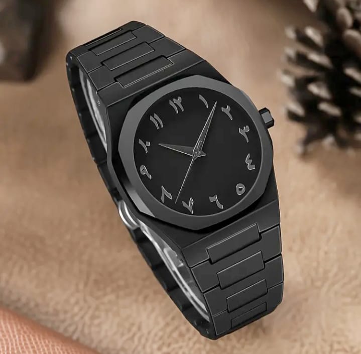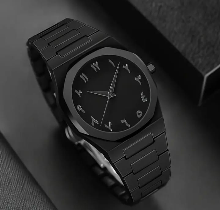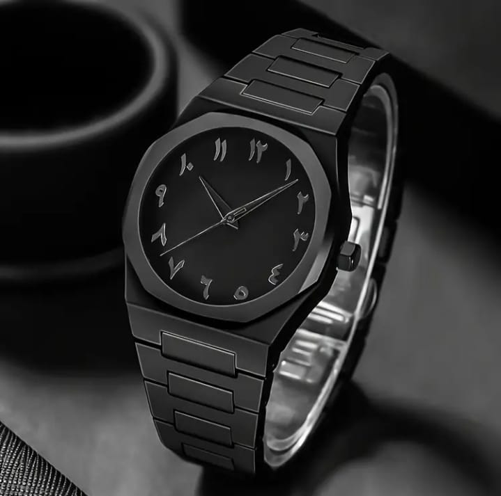 Matte black case with a clean, minimalist profile Round dial with a smooth, unmarked bezel Arabic numerals used as hour markers, giving a distinctive cultural design touch Black dial with subtle contrast between numerals and background Slim hour and minute hands with a matching seconds hand Simple three-hand analog display...